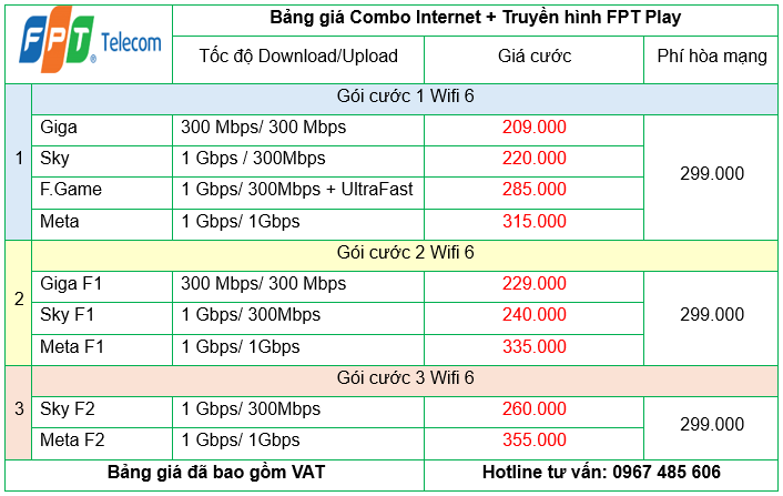 • Trả trước 6 tháng: Sử dụng 06 tháng. Tặng thêm 1 Mesh wifi khi đăng kí gói F1, F2