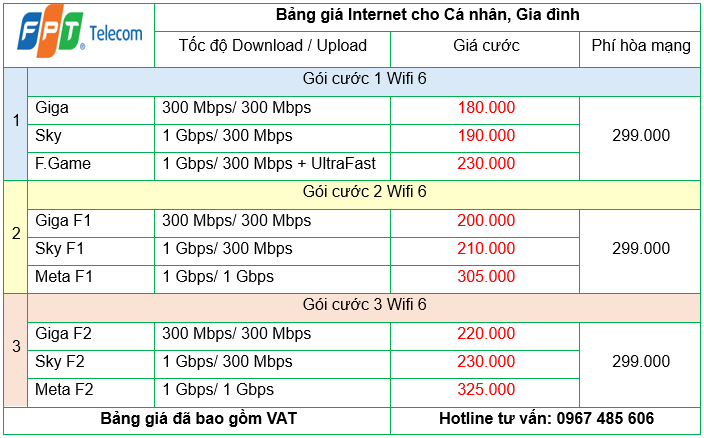 - Trả trước 6 tháng: Sử dụng 06 tháng. Tặng thêm 1 Mesh wifi khi đăng kí gói F1, F2