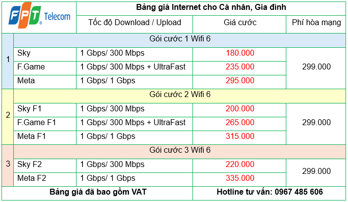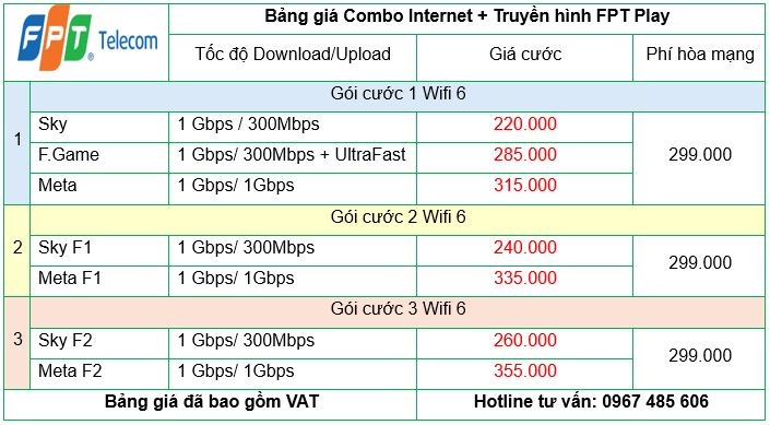 • Trả trước 6 tháng: Sử dụng 06 tháng. Tặng thêm 1 Mesh wifi khi đăng kí gói F1, F2
