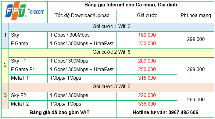 • Trả trước 6 tháng: Sử dụng 06 tháng. Tặng thêm 1 Mesh wifi khi đăng kí gói F1, F2