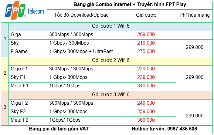- Trả trước 6 tháng: Sử dụng 06 tháng. Tặng thêm 1 Mesh wifi khi đăng kí gói F1, F2