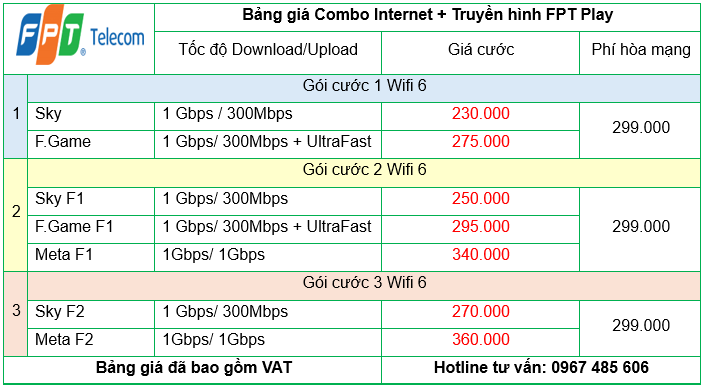 • Trả trước 6 tháng: Sử dụng 06 tháng. Tặng thêm 1 Mesh wifi khi đăng kí gói F1, F2
